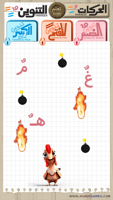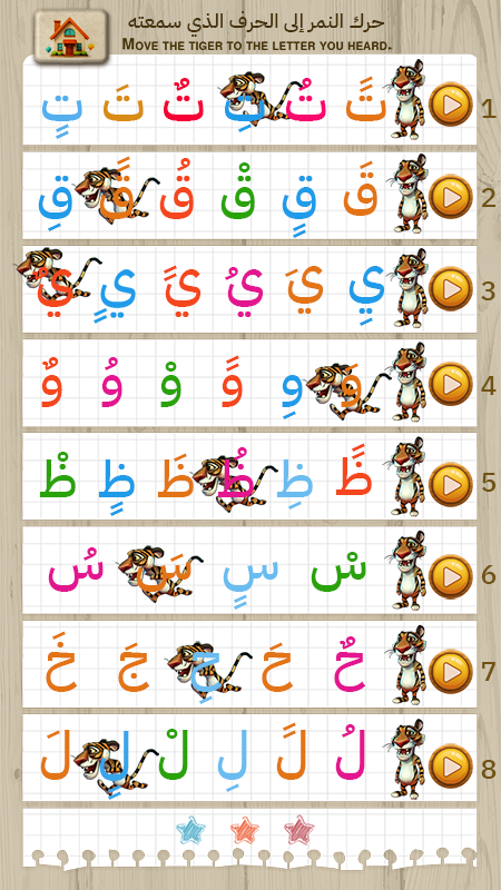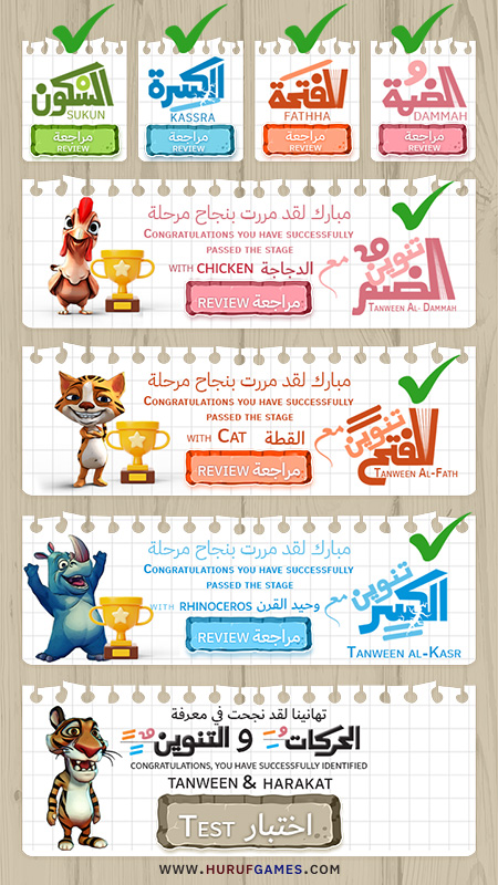 اللعبة عبارة عن سبع مراحل ولكل مرحلة حركة وسيعرف كامل الحركات الضمة – الفتحة – الكسرة – السكون ثم تنوين الضم و الفتح و الكسر ولكل مرحلة حيوان.